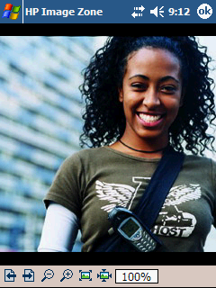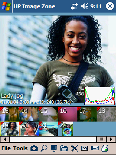 HP Image Zone – программа для просмотра изображений, близкая по интерфейсу к стандартному просмотрщику графических файлов в Windows XP, но несколько превосходящая его по возможностям. Как и Windows-программа, Image Zone отображает «киноленту» с кадрами картинок, находящихся в выбранной папке, выделенную же картинку выводит в окне в увеличенном виде, есть также возможность просматривать ее в отдельном окне, в полноэкранном режиме, с выбранным увеличением. Программа позволяет выполнять простейшие операции с графическими файлами – просматривать гистограмму текущей картинки, вращать ее, добавлять комментарии, перемещать в нужную папку, а также организовывать слайд-шоу, отправлять картинку по e-mail или IrDA, либо печатать ее на принтере посредством служб HP Mobile Printing или HP Instant Share Printing. При этом используется беспроводное подключение к принтеру через IrDA, Bluetooth или Wi-Fi; разумеется, принтер должен быть оборудован соответствующим адаптером и должен поддерживать соответствующие службы.