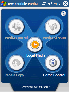 iPAQ Mobile Media – центральная медиа-программа rx3715, она позволяет управлять медиа-контентом, находящимся в памяти КПК, обмениваться им с другими компьютерами и бытовыми устройствами через беспроводное соединение, воспроизводить потоковые медиаданные, а также управлять бытовой техникой. Последняя функция реализована посредством известной утилиты от NeVo, о чем и сообщается в статусной строке главного окна программы.