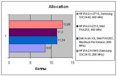 Как видим, у rx3715 очень низкая скорость передачи данных по шине памяти. Связано это с низкой производительностью шины нового процессора Samsung, или с недостаточным быстродействием установленной в КПК памяти – вопрос открытый, так как сейчас мы рассматриваем все устройство как «черный ящик», однако факт остается фактом – скорость выполнения операций с памятью - низка. Причем, если шина управления отрабатывает с достаточной быстротой, и тест на поиск данных в памяти демонстрирует высокие результаты (пропорциональные производительности процессора, в этом случае важна именно она), то собственно пересылка информации происходит медленно. И если производительность ядра CPU ненамного выше, чем у 400-мегагерцевых Intel, то по скорости работы с памятью rx3715 сильно отстает от предыдущих КПК среднего класса, и в итоге остается в проигрыше.