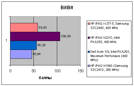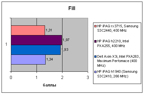 Поскольку видеопамять в Pocket PC представляет собой выделенную область в основной памяти, соответственно низка у rx3715 и скорость обработки видео. «Чистые» тесты на заполнение видеопамяти показывают все тот же невысокий результат, комбинированные же задачи, в которых происходит обработка видеоинформации, дают более приемлемые результаты (здесь всю систему несколько «подтягивает» быстрый процессор), но все же производительность устройства находится на относительно невысоком уровне.