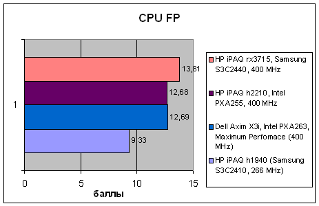Неожиданность номер раз: производительность процессора Samsung S3C2440, работающего на частоте 400 MHz, выше, чем у чипов Intel XScale PXA250/255/263, у которых быстродействие ядра прямо пропорционально частоте. По всей видимости, Samsung изыскала некий ресурс, позволивший увеличить скорость целочисленных вычислений и операций с плавающей запятой. Чтобы выяснить, что же у Samsung получилось лучше, чем у Intel, и насколько это положение дел сохраняется в разных приложениях и режимах работы, нужно провести подробный сравнительный анализ архитектур процессоров, а это выходит за рамки данной статьи.