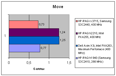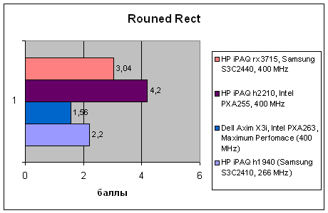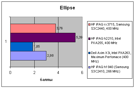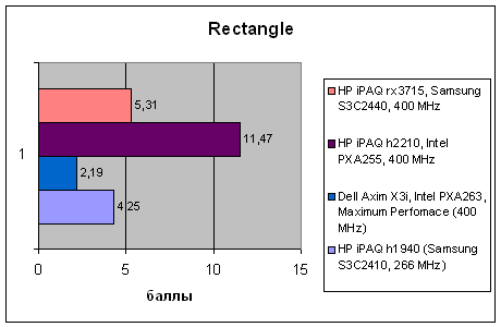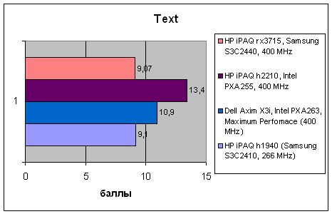 | Тест | HP iPAQ h1940 (Samsung S3C2410, 266 MHz) | Dell Axim X3i, Intel PXA263, Maximum Perfomace (400 MHz) | HP iPAQ h2210, Intel PXA255, 400 MHz | HP iPAQ rx3715, Samsung S3C2440, 400 MHz |