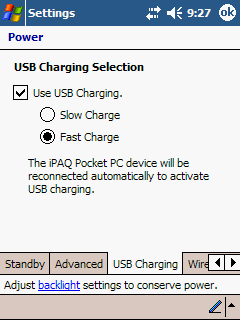 Настройки rx3715 также содержат ряд специфичных опций, характерных как для Windows Mobile 2003 SE, так и конкретно для данной модели. Это выбор режима USB -зарядки, управление ориентацией экрана. Подсветка имеет 10 градаций яркости, это позволяет гибко управлять энергопотреблением, так как основным «пожирателем заряда» в КПК является именно экранная подсветка. Возможности управлять частотой процессора нет.