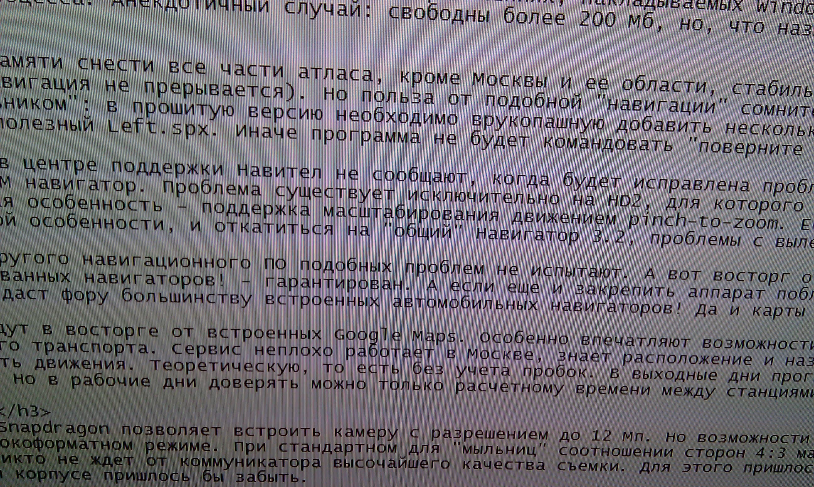 К сожалению, даже в прошивке версии 1.66 (вышедшей 2 февраля) идет нестабильная версия Навигатора. Программа регулярно выпадает с сообщением о нехватке памяти. Особенно часто сие происходит в часы пик, когда на улицах много пробок. Причины этого явления вовсе не в недостатке ОЗУ, а в ограничениях, накладываемых Windows Phone на максимальный размер адресного пространства процесса. Анекдотичный случай: свободны более 200 Мб, но, что называется, «в одни руки» больше 32 никому не достанется.