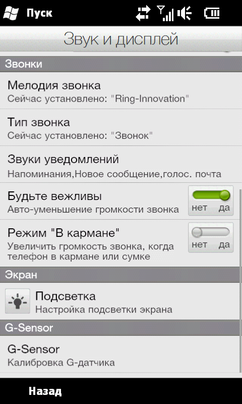 По сигналу с акселерометра коммуникатор может уменьшать громкость звонка до минимума. Функция называется «Будьте вежливы» и включается в разделе «Звук и дисплей». По умолчанию аппарат ведет себя вежливо.
