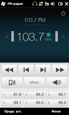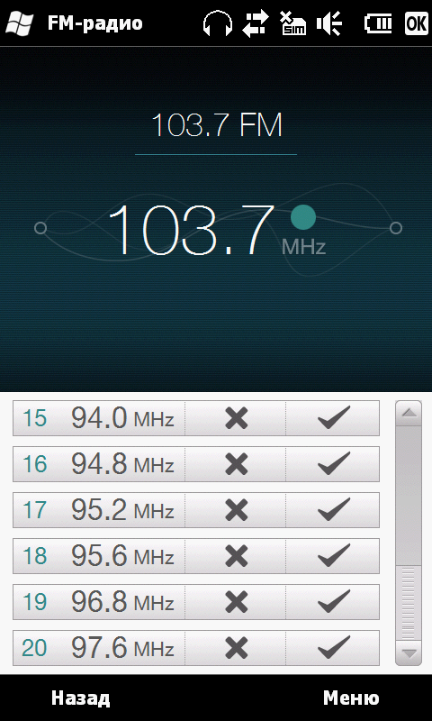 Еще один из плюсов платформы. В качестве антенны используется провод наушников (или гарнитуры). При первом же подключении (с MB Quart 220) в течение 40 секунд нашлись 20 каналов, от 87.9 МГц до 96.8 МГц. Безобразие, ведь на самом деле их должно быть вдвое больше! Виновник — программа FM-радио для Pocket PC, сборка 1919.4027, которая попросту не поддерживает список и более чем 20 каналов. Выбирайте, что хотите слушать. И будьте готовы к тому, что переименовать канал не выйдет, что пришло из RDS, то и будет отображаться. Если же захочется полистать каналы, не торопитесь многократно нажимать на кнопку «следующий», от секундной задержки не избавиться. А злопамятная программа обязательно подсчитает все нажатия и будет их выполнять с упорством, достойным лучшего применения.