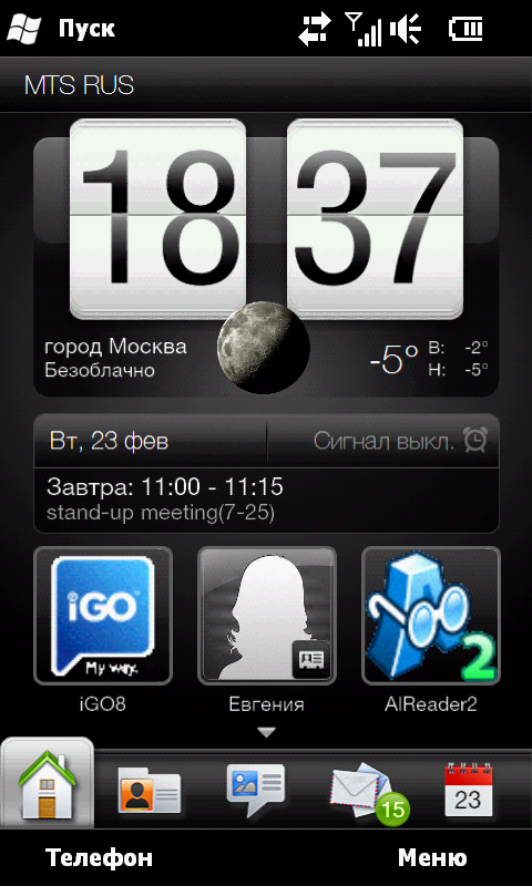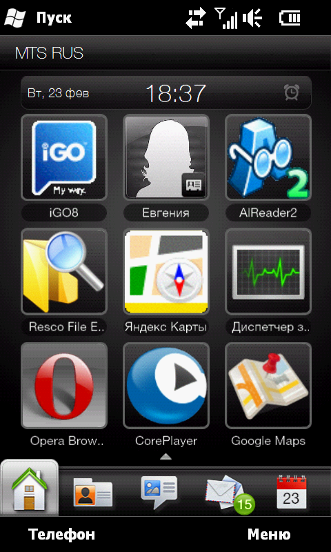 Разрешение 800x480 (WVGA) как раз впору для такой диагонали. Особо старательные смогут разглядеть отдельные пиксели, но вряд ли нормальному человеку придет в голову заниматься подобным делом. К тому же в HD2 использованы довольно необычные шрифты с полутонами. При их использовании устраняется необходимость в ClearType, буквы и без того читаются великолепно. Именно потому по умолчанию ClearType выключен. Вернуть его можно через реестр.