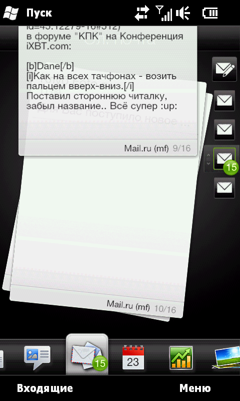 Под определенным углом видна сетка — характерный признак емкостного экрана. Да-да! HTC реализовала multitouch на Windows Phone 6.5! Значительная часть программ из оболочки Sense и часть стороннего ПО (та же Opera) уже поддерживает эту технологию. Но и старым приложениям кое-что перепало: pinch-to-zoom масштабирует стандартные окна.