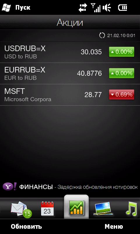 Если же вернуться к субъективной оценке, при интенсивном использовании зарядки хватает ровно на день: час чтения, час навигации, час музыки, периодическая выборка почты, прогноза погоды и курса валют (введите USDRUB=X или EURRUB=X в окне «название акции» для получения курса с Yahoo.Finance) через сотовую сеть, а также периодические звонки.