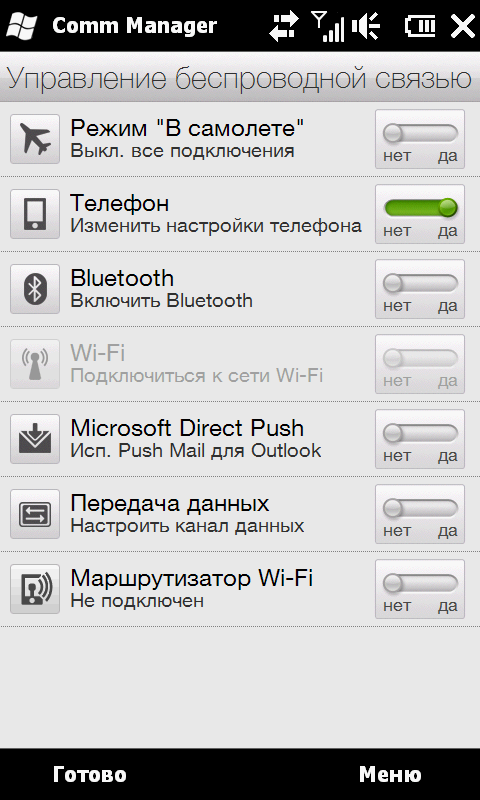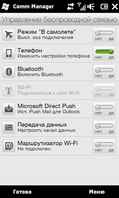 Доступ к Wi-Fi сетям контролируется традиционным Comm Manager. При подключении через USB Wi-Fi автоматически отсоединяется.