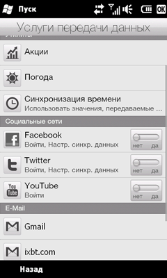 Не обошлось и без характерных недостатков емкостных экранов. Перчатки, так актуальные в холодное время года, мешают распознаванию нажатий. Хорошо еще, что диалоги Windows хорошо упрятаны за глянцевым фасадом HTC Sense. Все, кроме очень нужного «Управления подключениями». И тогда только гигантские размеры экрана спасают емкостной экран от проклятий. Иными словами, благодаря 4.3" счастья, работа без стилуса вполне комфортна даже со скидкой на торчащие уши ориентированной на перо ОС.
