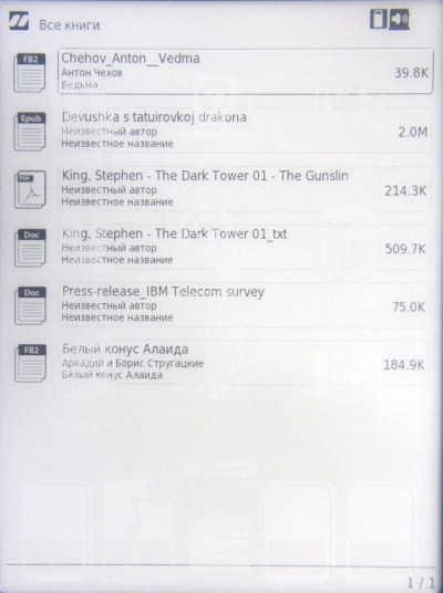 inch A5i поддерживает все распространенные форматы электронных книг: FB2, RTF, PDF, DOC, DJVU, HTML, TXT, EPUB, а также архивы с ними: ZIP и RAR. Файлы отображаются в меню своих библиотек в виде списка названий с иконками-обложками.