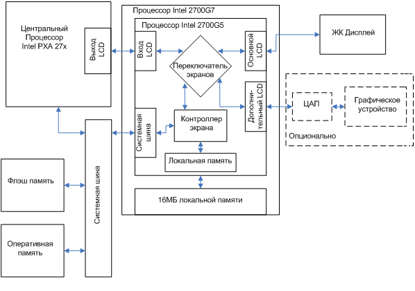Системная шина процессора Intel XScale PXA 27x работает на частоте 100 МГц, что при разрядности 32 бита позволяет осуществлять обмен данными на скорости до 400 МБ/сек. Рабочие напряжения шины 1,8 В и 2,5 В. Из всех многочисленных протоколов, работающих с системной шиной, для обмена графической информацией предназначены два: SRAM — для записи и VLIO для записи/чтения. SRAM обеспечивает наибольшую скорость записи по сравнению с VLIO. Оба используются контроллером 2700G.