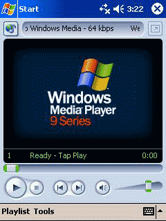 В Windows Mobile 2003 появилась новая версия универсального проигрывателя — Windows Media Player 9. Он отличается в первую очередь поддержкой новой версии формата кодирования аудио и видео — Windows Media v9. Другим видимым для пользователя усовершенствованием является возможность отображения видео в полноэкранном режиме с поворотом на 90 градусов (в ландшафтной ориентации), что делает просмотр роликов более удобным. Как и прежде, поддерживаются аудиоформаты MP3 и WMA, и видео — WMV. К сожалению, отсутствует поддержка MPEG-1 и MPEG-4, для проигрывания этих форматов придется пользоваться соответствующими программами-плеерами. К слову, Pocket DivX;) версии 0.8 (самый «свежий», доступный пока для загрузки) работал на h1940 не совсем корректно — звук воспроизводился со значительной потерей качества и перебоями. По всей видимости, полноценную поддержку MPEG-4 на платформу Windows Mobile 2003 принесет только новый релиз этого проигрывателя (который, к слову, не обновлялся уже больше года).