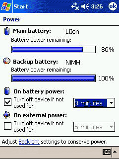 С помощью пакета тестов продолжительности автономной работы КПК из программы Spb Benchmark удалось оценить характеристики энергопотребления h1940. К сожалению, и здесь проявилась неполная совместимость с Windows Mobile 2003 — тестовое приложение не смогло автоматически запустить Windows Media Player, необходимый для измерения показателей в распространенных режимах «воспроизведение видео при максимальной яркости подсветки» и «воспроизведение MP3 при выключенном экране». Измеренное нами время работы при эмуляции «стандартного» использования, включающего запуск Pocket Word и File Explorer, и максимальной яркости подсветки составило 3 ч 45 мин. Это не очень высокий показатель.