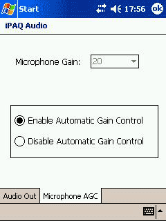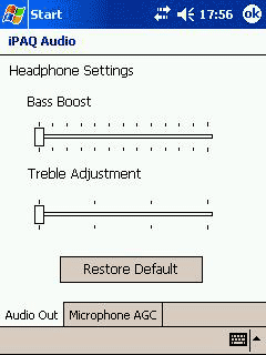 Апплет iPAQ Audio позволяет регулировать усиление низких частот и баланс сигнала на наушниках, а также настраивать опции автоматической регулировки усиления встроенного микрофона.