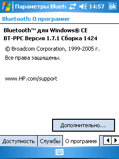 Hewlett-Packard заменила стандартные драйверы операционной системы, где только возможно. Используется модуль Bluetooth версии 1.2, программная поддержка осуществляется стеком от компании Broadcom, что не может не радовать. Доступны следующие профили работы через этот интерфейс: Передача файлов OBEX, обмен PIM данными, эмуляция последовательного порта, предоставление доступа в сеть (сервер сети), голосовой шлюз.