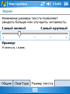 Все остальные настройки стандартны и обеспечиваются самой операционной системой: ориентация экрана, размер шрифта, использование технологии ClearType с помощью утилит Подсветка и Экран.