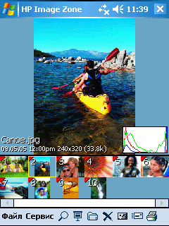 В качестве программы просмотра фотографий HP предлагает приложение Image Zone. Программа быстро работает с изображениями, отображает гистограмму и расширенные параметры фотографий. Позволяет проводить небольшую обработку изображений и запускать слайд-шоу. Есть возможность выводить информацию на внешний экран, для чего необходимо приобрести соответствующую карту расширения. Иконка принтера и пункт меню «Печать» предлагают перенести фотографии на карту памяти или использовать принтер с технологией Instant Share (как нетрудно догадаться, производства самой HP).