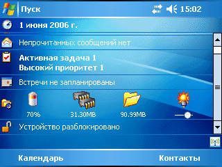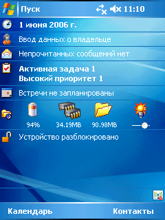 В КПК HP hx2790 используется операционная система Windows Mobile 5.0. Описывать все её особенности, недостатки и преимущества нет смысла, достаточно взглянуть на наши предыдущие статьи о наладонниках под её управлением. Существенное отличие от них у hx2790 одно — изначально установлена русская версия ОС. Данное обстоятельство позволило вдоволь «насладиться» локализацией ОС силами программистов Microsoft. Ляпов много, в том числе по переводу интерфейса. Например, режим работы беспроводных интерфейсов Flight mode перевели, как Включение телефона.