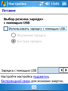 Процесс восполнения заряда аккумулятора наладонника происходит при помощи зарядного устройства или при подключении к порту USB. В первом случае он занимает по времени чуть более 2 часов. Метод зарядки (потребляемая мощность) от порта USB выбирается на вкладке системной настройки питания. Медленная зарядка будет наполнять аккумулятор только при выключенном КПК, быстрая позволит, не прерывая процесс зарядки, пользоваться наладонником. Рассчитывать всерьез на эту возможность не стоит. Как показали измерения, процесс зарядки от порта USB даже без ограничения потребляемой мощность очень медленный, для достижения 80% уровня заряда потребовалось примерно 6 часов.