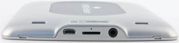 Задняя панель планшетного компьютера изготовлена даже более интересно, чем фронтальная. Здесь заметны зачатки дизайна и хоть какие-то попытки придать компьютеру индивидуальность. Впрочем, за исключением центральной овальной панели с логотипом компании и названием устройства (почему-то в горизонтальной ориентации устройства. Дизайнеры думали, что окружающие люди будут наклонять голову, чтобы прочитать название?), все остальные изгибы корпуса и «выштамповки» служат исключительно утилитарным целям.
