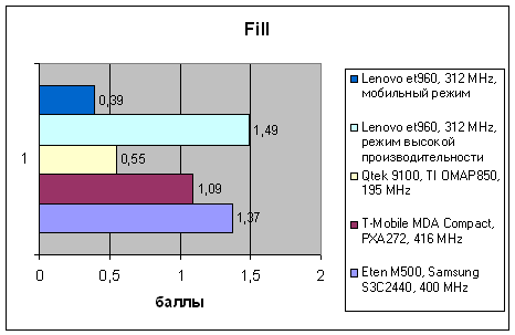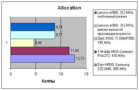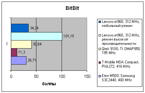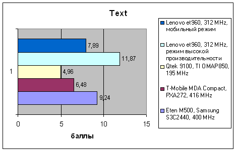 | VOBenchmark | Eten M500, Samsung S3C2440, 400 MHz | T-Mobile MDA Compact, PXA272, 416 MHz | Qtek 9100, TI OMAP850, 195 MHz | Lenovo et960, 312 MHz, режим высокой производительности | Lenovo et960, 312 MHz, мобильный режим |
