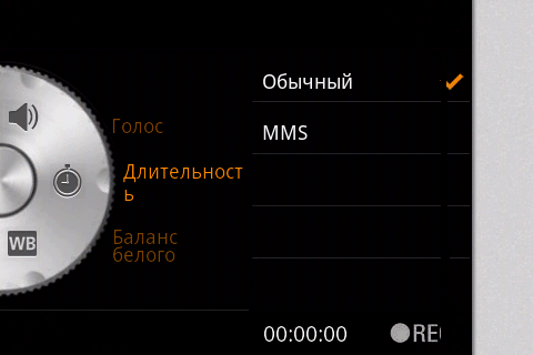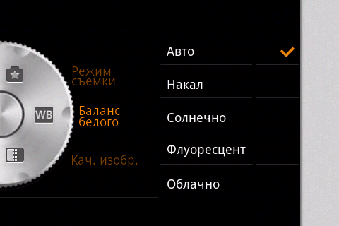 Меню дополнительных настроек оформлено в стиле круглого переключателя фотоаппарата и содержит следующие пункты: включение привязки снимка к координатам, сетка, обнаружение моргания, качество снимка, баланс белого, режим съемки, таймер, ISO, сюжетные эффекты, цветовые программы, отключение автофокуса.