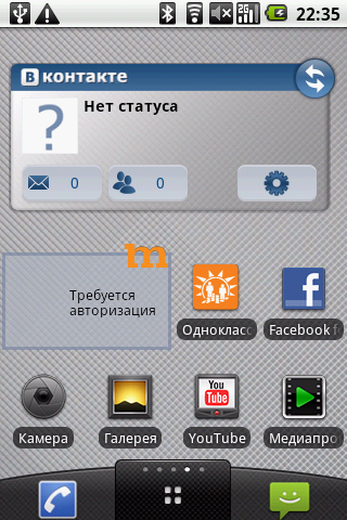 Следующая вкладка рабочего стола радует наличием виджетов для информирования о статусе анкет в социальной сети Вконтакте и сети знакомств Mamba. Иконки Одноклассников и Facebook просто открывают соответствующие страницы в браузере. Здесь же можно активировать фотокамеру или попасть в фотоальбом, который представляет собой удобное, но несколько перегруженное спецэффектами приложение. С его помощью можно быстро просмотреть фото и видеофайлы из памяти коммуникатора.