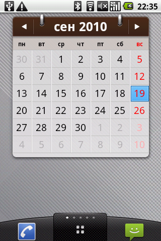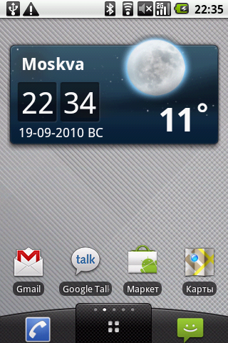 Виджет запомнился двумя вещами: он способен определять местоположение аппарата на основе GPS-данных и, соответственно, выдавать прогноз. Насколько он будет адекватным при нахождении в месте, неизвестном программе — загадка. Вторая особенность виджета — система поиска городов, которая функционирует в латинской раскладке и с жуткой системой транслитерации. Автор долго пытался найти «Москва» или «Moscow», оказалось, что нужно искать город «Moskva».