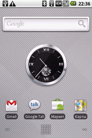 Переходим к четвертой вкладке. На ней расположились виджет с прогнозом погоды и иконки традиционных приложений Google: Gmail, Talk, Market, Maps.