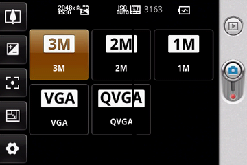 Если нажать на экран коммуникатора во время работы программы управления камерой, на нем появятся несколько иконок с настройками: цифровой зум, коррекция экспозиции, вид съемки, разрешение снимка, а также открытие окна с дополнительными настройками. Максимальное разрешение фотографий 2048×1536 пикселей, видеороликов 640×480 пикселей. Формат видеозаписи MPEG4, длительность роликов не ограничена.
