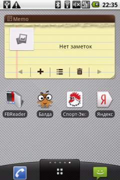 На третьей вкладке взору предстают: виджет с заметками Memo, иконка программы FBReader, которая не запускается, ярлык игры Балда, которая не запускается, ссылка на сайт Спорт-Экспресс и виджет поиска информации в Яндексе. (В новой версии прошивки проблемы с этими приложениями были исправлены).