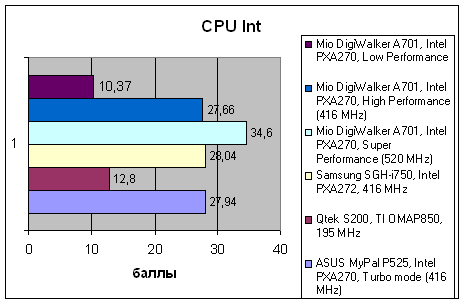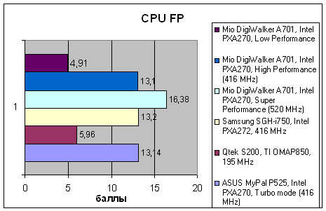 | VOBenchmark | ASUS MyPal P525, Intel PXA270, Turbo mode (416 MHz) | Qtek S200, TI OMAP850, 195 MHz | Samsung SGH-i750, Intel PXA272, 416 MHz | Mio DigiWalker A701, Intel PXA270, Super Performance (520 MHz) | Mio DigiWalker A701, Intel PXA270, High Performance (416 MHz) | Mio DigiWalker A701, Intel PXA270, Low Performance |