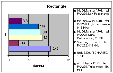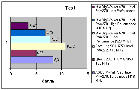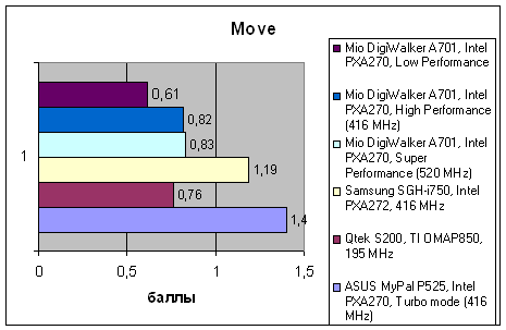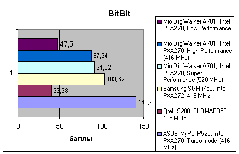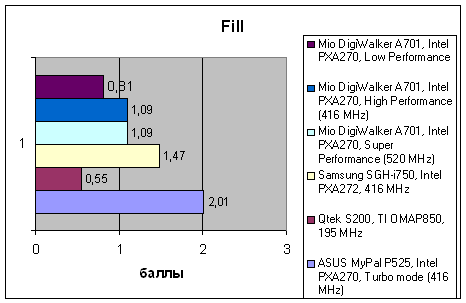 Традиционно слабое место продуктов Mitac/Mio – слабая подсистема памяти. Невысокая скорость операций с памятью в архитектуре Pocket PC автоматически означает понижение быстродействия видеоподсистемы. Эта проблема присутствует и в A701, что хорошо видно по результатам теста Fill, где в память заносится массив одинаковых данных. Возросшая вычислительная мощь процессора уходит на компенсацию этого отставания, и в результате суммарная производительность коммуникатора находится примерно на том же уровне, где находятся коммуникаторы Samsung, E-Ten и ASUS с 400-мегагерцевыми CPU, хотя даже от них A701 умудряется немного отставать.