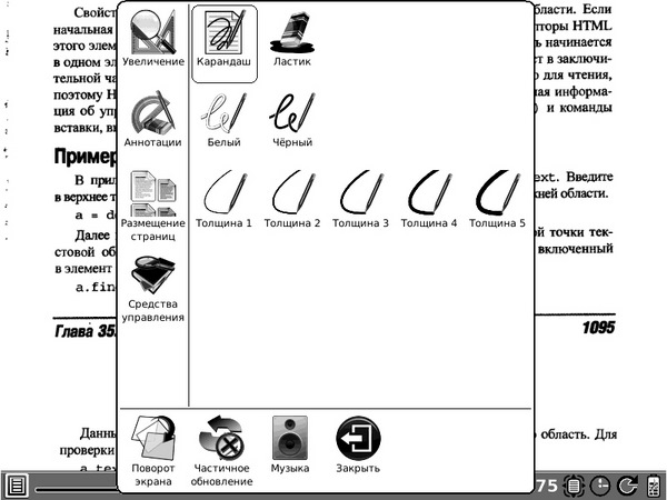 При просмотре PDF тоже имеется много настроек, но они другие. Масштабирование страницы может быть задано в процентном соотношении (от 75 до 400 процентов), но страница может также быть подогнана под размеры экрана. Есть и выделение «выбранной области», что позволяет отсечь все пустоты на странице, уделив больше места для текста. Меняется и размер шрифта, он указан в процентах от 100 до 500. К книге можно делать пометки — как рукописные (грубо говоря, вы рисуете поверх текста, и эти рисунки при следующем открытии книги никуда не пропадают), так и «машинописные», набираемые на виртуальной клавиатуре. Они заносятся в базу, которую можно открыть и посмотреть все сделанные аннотации (именно так они называются).