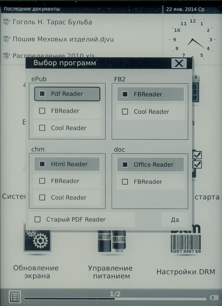 В качестве программ для чтения электронных книг в Onyx Boox i62ML используются популярные FBReader и Cool Reader, переключаться между ними можно в соответствующем меню настроек. Исходя из этого можно сделать предположение, что и младшая модель в рассматриваемой паре читалок работает под управлением Android — но более «урезанного» варианта этой операционной системы.