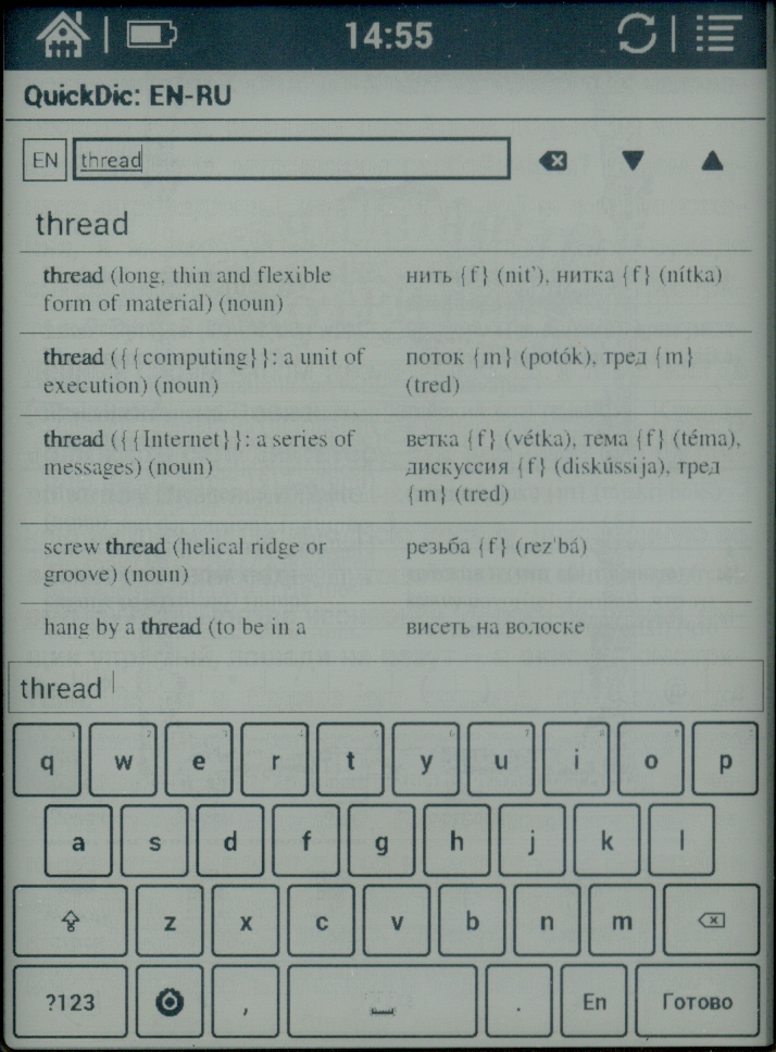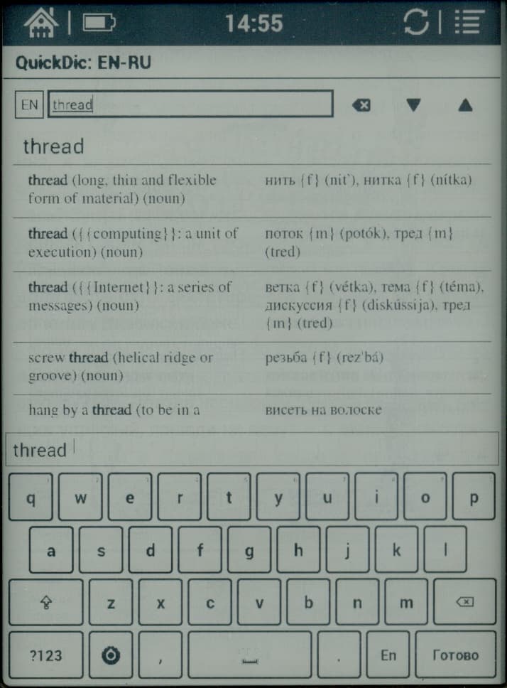 Как и в Onyx Boox i62ML, в старшей модели для чтения электронных книг используются FBReader и Cool Reader, а Adobe Reader отвечает за работу с PDF. Внешний вид всех приложений значительно изменен в сравнении с их обычными версиями из Android Market, установить изначальные варианты программ самостоятельно нельзя. Вместо словаря Lingvo в Onyx Boox i63ML установлен словарь QuickDic.