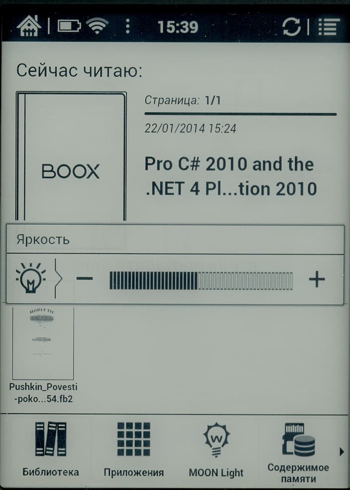 При тусклом освещении ситуация меняется на противоположную: LCD-дисплеи показывают яркую картинку, в то время как текст на экране E-Ink-читалки может становиться трудноразличимым — белый пигмент электронных чернил до сих пор не может сравниться по белизне с бумагой. На помощь в данном случае приходит подсветка экрана Moon Light. Мощная подсветка для E-Ink-дисплеев не нужна, так как с солнцем ей соревноваться не нужно, в темноте же от яркого экрана быстро устают глаза. У рассматриваемых планшетов мощность подсветки дисплея следующая: 100 кд/м² — Onyx Boox i62ML, 60 кд/м² — Onyx Boox i63ML. Как видно, использовать ее можно и нужно только для чтения в помещении. Яркость подсветки задается вручную. Дополнительно экраны героев обзора оснащены антибликовым матовым фильтром.