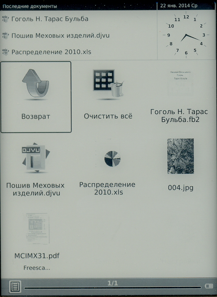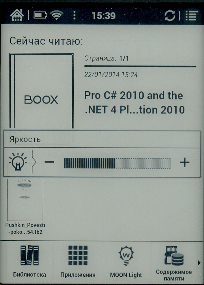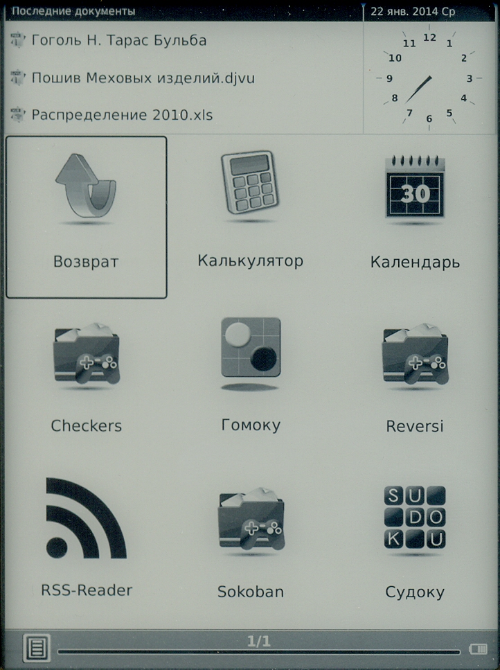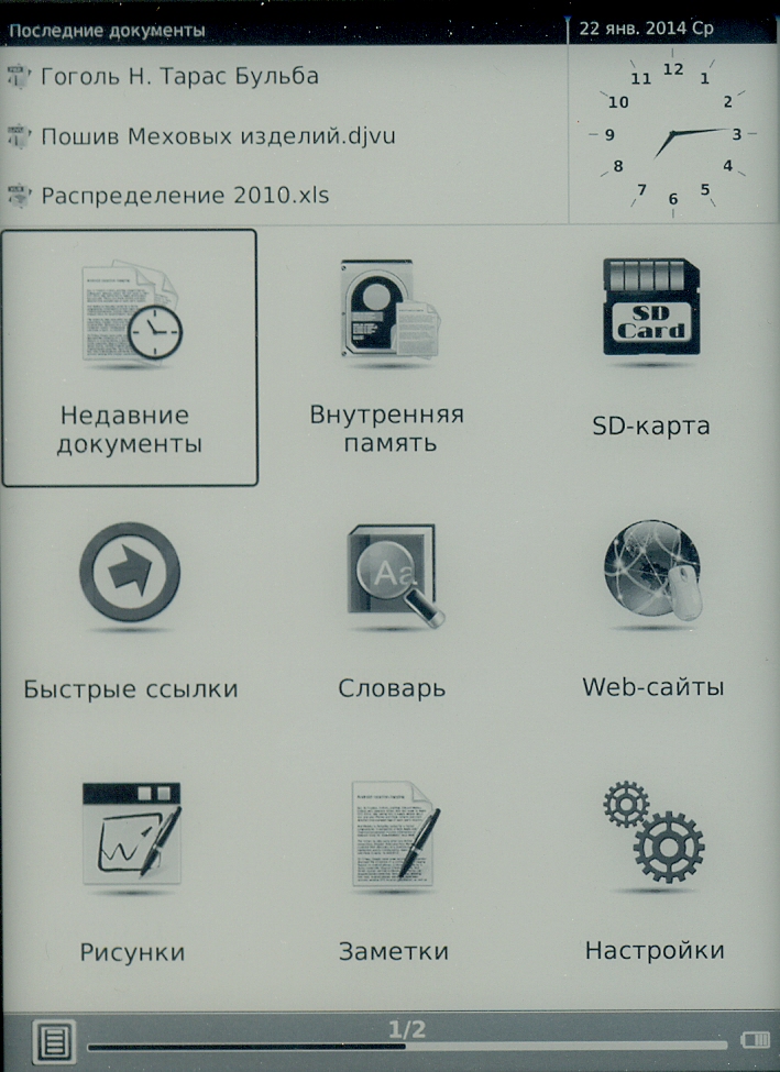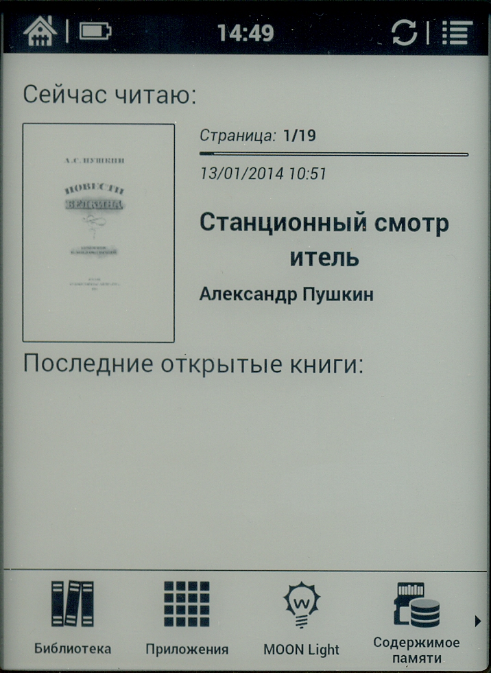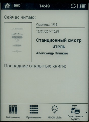 Внешний вид оболочки у двух читалок отличается, в Onyx Boox i63ML он более приближен к стандартам Android. В верхней части экрана располагается меню с индикаторами заряда батареи и уровнем сигнала сети Wi-Fi. Там же находятся кнопки вызова меню и возврата к основному экрану системы. В нижней части дисплея собраны значки наиболее используемых функций читалки: библиотека, приложения, подсветка, файловый менеджер, настройки и браузер. Центральная область основного экрана системы отведена для демонстрации последних прочитанных и читаемых книг и файлов.