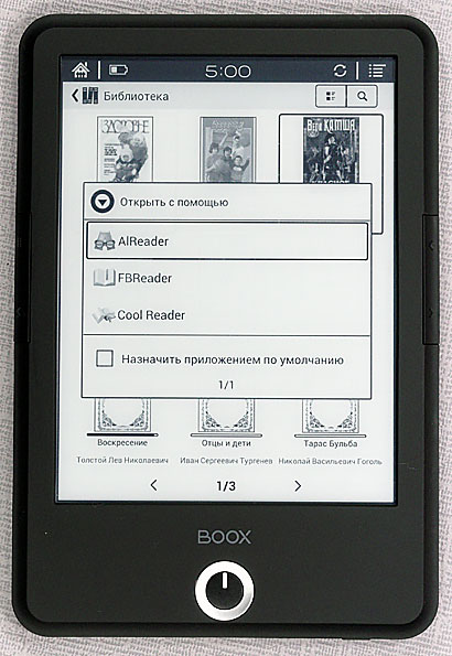 Опции для конкретного файла включают выбор программы для открытия («родной» AlReader, FBReader или широко известный Cool Reader), просмотр информации (также позволяющий открыть файл одной из программ), изменение имени и удаление.