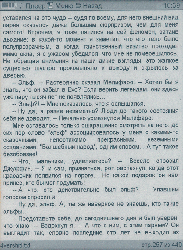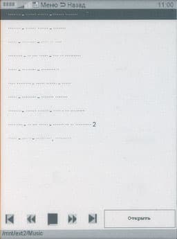 Наличие относительно большого объема памяти и встроенного не самого медленного процессора позволило наделить устройство также и некоторой дополнительной функциональностью, а именно — возможностью проигрывать МР3-файлы. Согласитесь, что читать под музыку лучше, чем в тишине. Особенно если делать это в транспорте. Плеер простенький, но для фонового звукового сопровождения процесса чтения его возможностей вполне достаточно. Пока имеют место быть проблемы с символами кириллицы, что хорошо видно на скане, но особо критичными их считать не стоит — выбрать песню можно просто в файловом менеджере (там проблем никаких), а все остальное время на сам плеер никто смотреть и не будет: он для фонового воспроизведения музыки. Правда вот некоторые детали реализации удовольствие от данной функциональности сильно портят. Во-первых, разъем для наушников 2.5 мм, так что придется ограничиться комплектными ушками, скорее всего. И переходники тут не решение проблемы — выход на наушники, вместе с USB-разъемом расположены в углублении корпуса, так что большинство переходников на 3.5 мм воткнуть в разъем полностью просто не выходит. К тому же, производитель зачем-то решил закрыть это углубление резиновой крышкой. В случае USB оно оправдано, но зачем было прикрывать и выход на наушники? Так что если вас даже будет устраивать найденная модель последних с тонким джеком (комплектная, например) общая конструкция все равно, мягко говоря, далека от идеала — будет упомянутая резинка болтаться. Это, как минимум, не очень красиво, да и неудобно. Не говоря уже о том, что последняя может и оторваться в итоге.