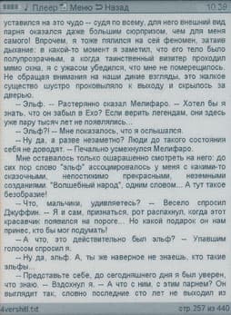 В качестве сервисных возможностей присутствует изменение размера шрифта «на лету» (его можно отрегулировать и в меню настроек), а также закладки. Их количество практически неограниченно. Причем в главном меню есть специальный пункт для управления закладками. Очень удобно, когда нужно открыть какой-то файл в запомненном месте, да и при чтении всегда можно перейти к следующей или предыдущей закладке «листая» книгу по ним. Есть также возможность перехода к странице с указанным номером, а также к последней прочитанной. Именно на ней, кстати, файл открывается при выборе из браузера. Причем то, какие книги вы читали, и на какой странице остановились, запоминается в специальной истории чтения, быстрый доступ к которой также возможен прямо из главного меню.