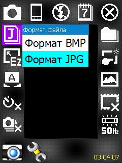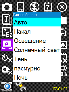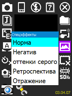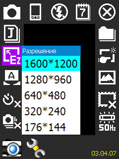 Из настроек фоторежима доступны: формат выходного файла JPG или BMP (большинство встроенных камер позволяют сохранять фотоснимки только в формате JPG), разрешение снимка от 176х144 до 1600х1200 пикселей. Баланс белого можно выставить в 7 режимах, доступно 6 различных эффектов съемки и несколько художественных рамок для фотоснимков