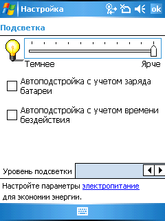 Подсветка настраивается в широких пределах, и, что приятно, может быть полностью отключена. В соответствующих настройках устанавливаются интервалы ожидания действия пользователя и отключения подсветки, а также зависимость уровня подсветки от типа электропитания коммуникатора.