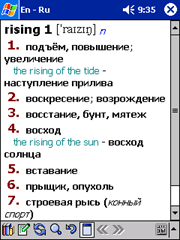 Если в Google, например, ввести запрос «Pocket PC dictionary», то сразу понимаешь, насколько высока конкуренция на рынке программных словарей: среди них есть общие и специализированные, включая толковые (медицинские, например), а также англо-английские и русско-английские для перевода в обе стороны, есть даже говорящие. Есть бесплатные и коммерческие. Разброс цен высок: от $12 (Lexisgoo [3]) до $100 (ECTACO Voice Translator for Pocket PC English <-> Russian [4]). Интерфейс всех словарей (программных) близок друг к другу. Интуитивно понятно, как работать с программами даже без ознакомления с руководствами. Сравните рисунки: