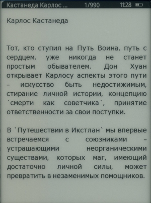 Непосредственное листание страниц производится нажатием на упомянутую пятипозиционную центральную клавишу, других вариантов для перелистывания здесь нет. Хотелось бы видеть дублирование таких основополагающих для электронной книги функций и на боковых гранях. Это было бы удобно при вертикальном расположении ридера, тем более, что большой палец не всегда с комфортом дотягивается до центральной клавиши. Кстати, автоматического поворота экрана здесь нет, для этого следует использовать специально отведенную для этих целей кнопку. Хорошо бы еще, чтобы изменение ориентации происходило во всех четырех направлениях, а не только в двух, потому что левше листать страницы пальцем правой руки не слишком удобно, а горизонтальное положение здесь лишь одно — когда джойстик всегда оказывается справа.
