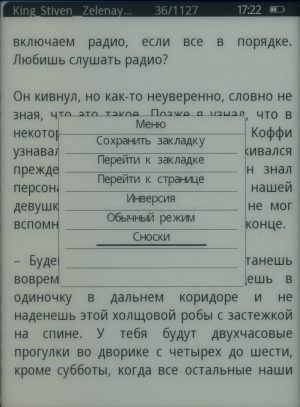 Есть небольшое контекстное меню, которое вызывается во время чтения по нажатию на центральную кнопку, и из которого можно произвести несколько действий. Отсюда можно перейти к закладкам, осуществить навигацию по страницам и выбрать «ночной» вариант, когда белый текст отображается на черном фоне. Переход к сноскам возможен только в формате FB2 и реализован он таким образом: из этого же самого контекстного меню заходишь в раздел «Сноски» и прочитываешь искомую под нужным номером, а потом возвращаешься к чтению нажатием клавиши «Назад». На этом возможности контекстного меню, да и вообще все возможности как-то повлиять на процесс чтения заканчиваются.
