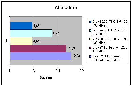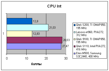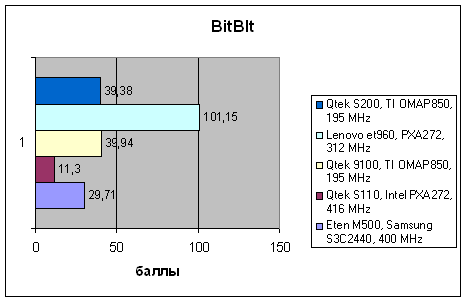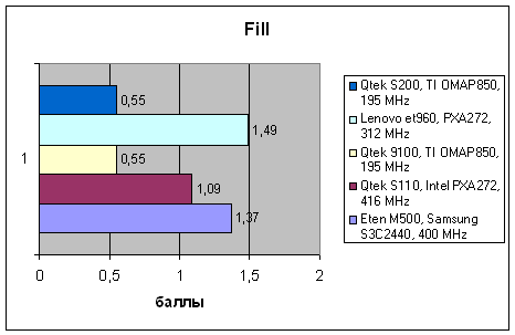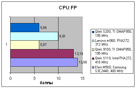 | VOBenchmark | Eten M500, Samsung S3C2440, 400 MHz | Qtek S110, Intel PXA272, 416 MHz | Qtek 9100, TI OMAP850, 195 MHz | Lenovo et960, PXA272, 312 MHz | Qtek S200, TI OMAP850, 195 MHz |