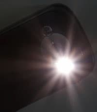 На задней поверхности расположены динамик вызова/громкой связи, разъём внешней антенны, объектв основной камеры с ручным переключателем макро-режима и лампу подсветки для съёмки слабоосвещенных объектов.